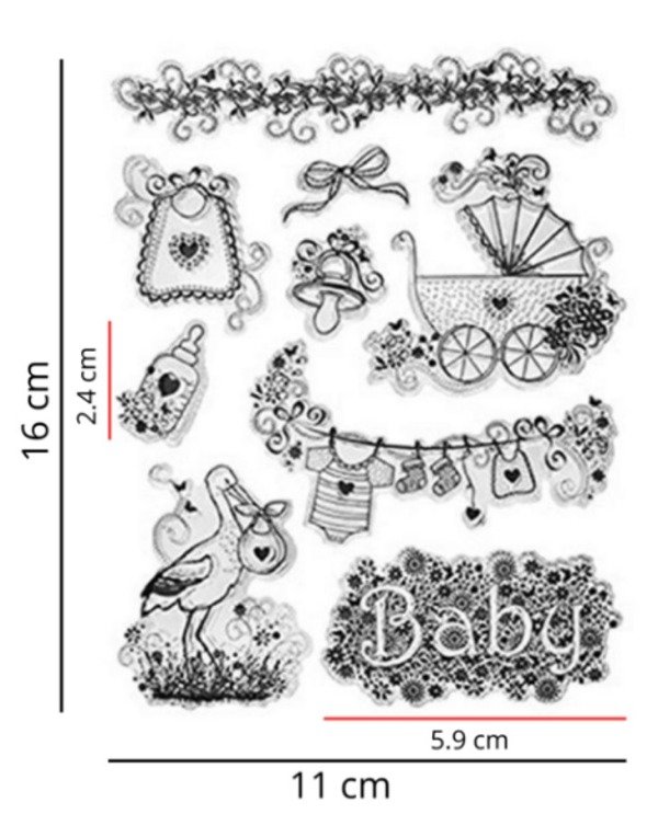 Descubre la plancha de sellos de silicona Baby, Bebe, Cigueña, diseñada para dar un toque especial a tus proyectos de manualidades. Este set incluye sellos de alta calidad que permiten una impresión clara y nítida.