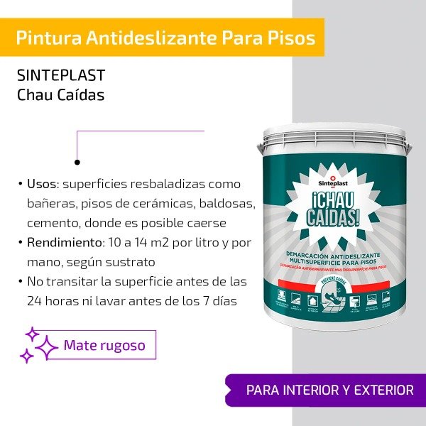 Indicada para evitar caídas en forma preventiva en aquellas superficies resbaladizas como bañeras, pisos de cerámicas, baldosas, cemento y más, donde es posible caerse. En cordones de vereda, o sectores específicos se utiliza como pintura de demarcación, cumpliendo una función dual.